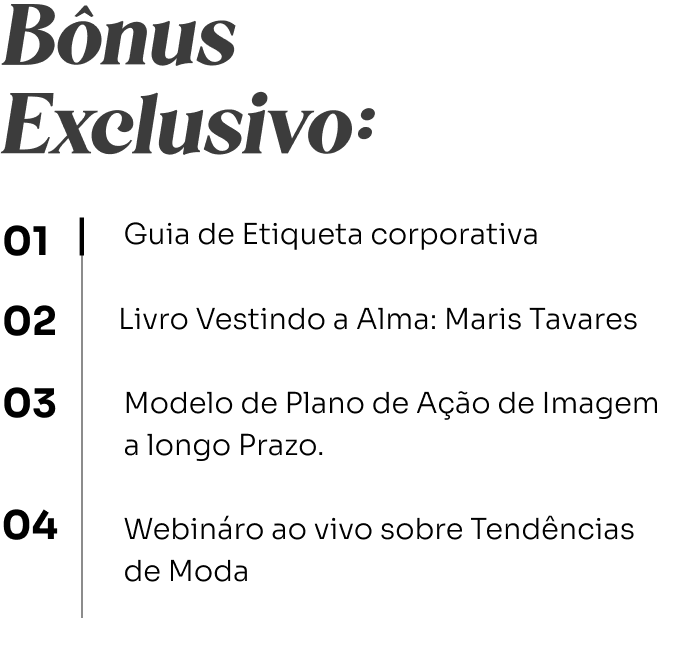 Você está pronto para transformar sua carreira e se destacar no mercado? No curso Abrindo Portas com o Poder da Imagem, Maris Tavares, Embaixadora da Moda Sustentável para a Agenda 2030 da ONU, Consultora de Imagem, Escritora e Palestrante, traz mais de 15 anos de experiência construindo estrelas com seu método inovador, a Consultoria de Imagem Além da Aparência. Reconhecida pela Folha de São Paulo como uma das principais responsáveis pela mudança de estilo do brasileiro na última década, Maris é especialista em posicionamento de imagem, com mais de 30 mil horas de atendimento prático e clientes em três continentes.